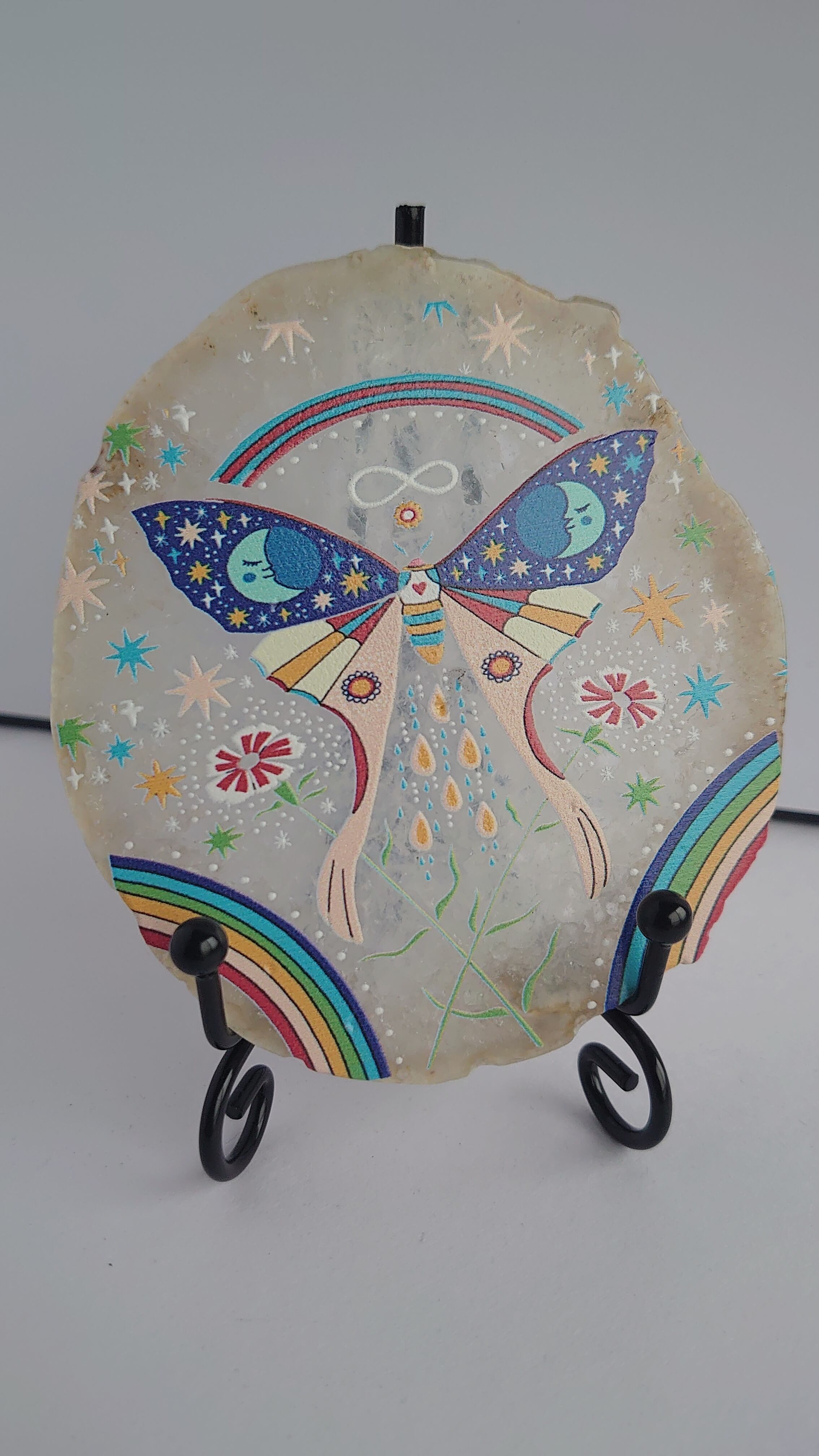 天然石=アゲート(瑪瑙)・プレート 大きさ=約9.4㎝✖約8.5㎝ アゲートに描かれた可愛い蝶♡ 温かみのある絵です♡ 台座付きなのでどこでも飾れます♡